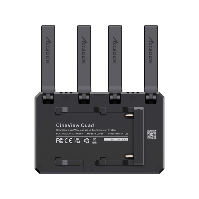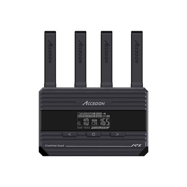 Az Accsoon CineView Quad egy SDI&HDMI kétsávos (2,4 GHz és 5 GHz) vezeték nélküli kamera-videó adó- és vevőrendszer, amely egyedülálló, összecsukható antennával rendelkezik. Az Accsoon egyedülállóan szabadalmaztatott kétsávos átviteli technológiáján keresztül HD videót és HQ hangot továbbít és fogad. A Dual-Band átviteli technológiával a CineView Quad 150 méteres (500 láb) hatótávolságon keresztül képes adatokat közvetíteni közel nulla késleltetéssel.