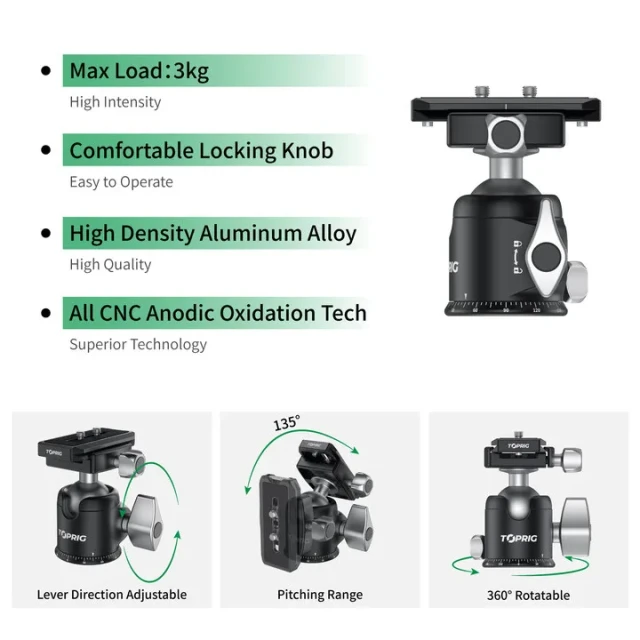 Az Accsoon ACC-BH-01 TopRig gömbfej egy kompakt, mégis nagy teljesítményű alumínium állványfej, amely sima 360°-os panorámás forgással, gyorskioldó lemezzel és széles körű kompatibilitással rendelkezik kamerák, állványok és monopodok számára.