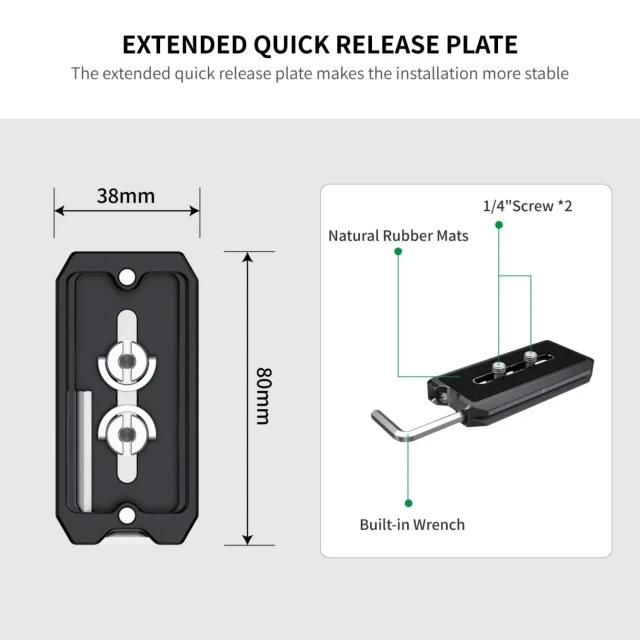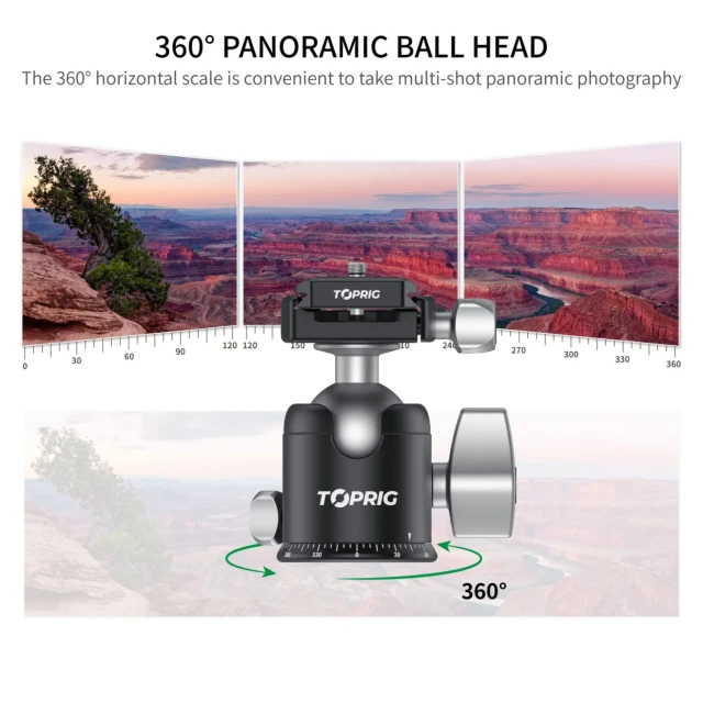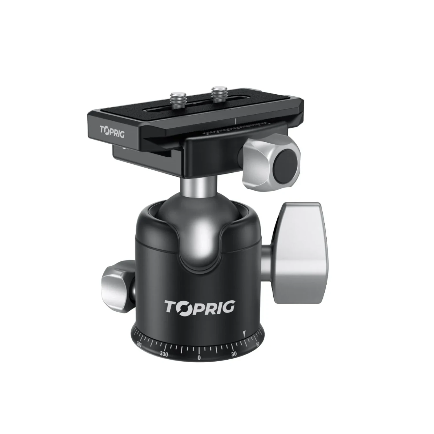 A 36 mm-es precíziós gömbvel felszerelt TopRig gömbfej folyékony szögbeállítást és 360°-os panorámás forgatást tesz lehetővé, így zökkenőmentes tájkép-, portré- és panorámaképek készíthetők. Az 51 mm-es alapátmérő növeli a stabilitást, míg az integrált 1/4”-es gyorskioldó lemez biztosítja a fényképezőgép gyors felszerelését és eltávolítását.