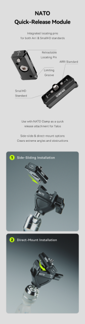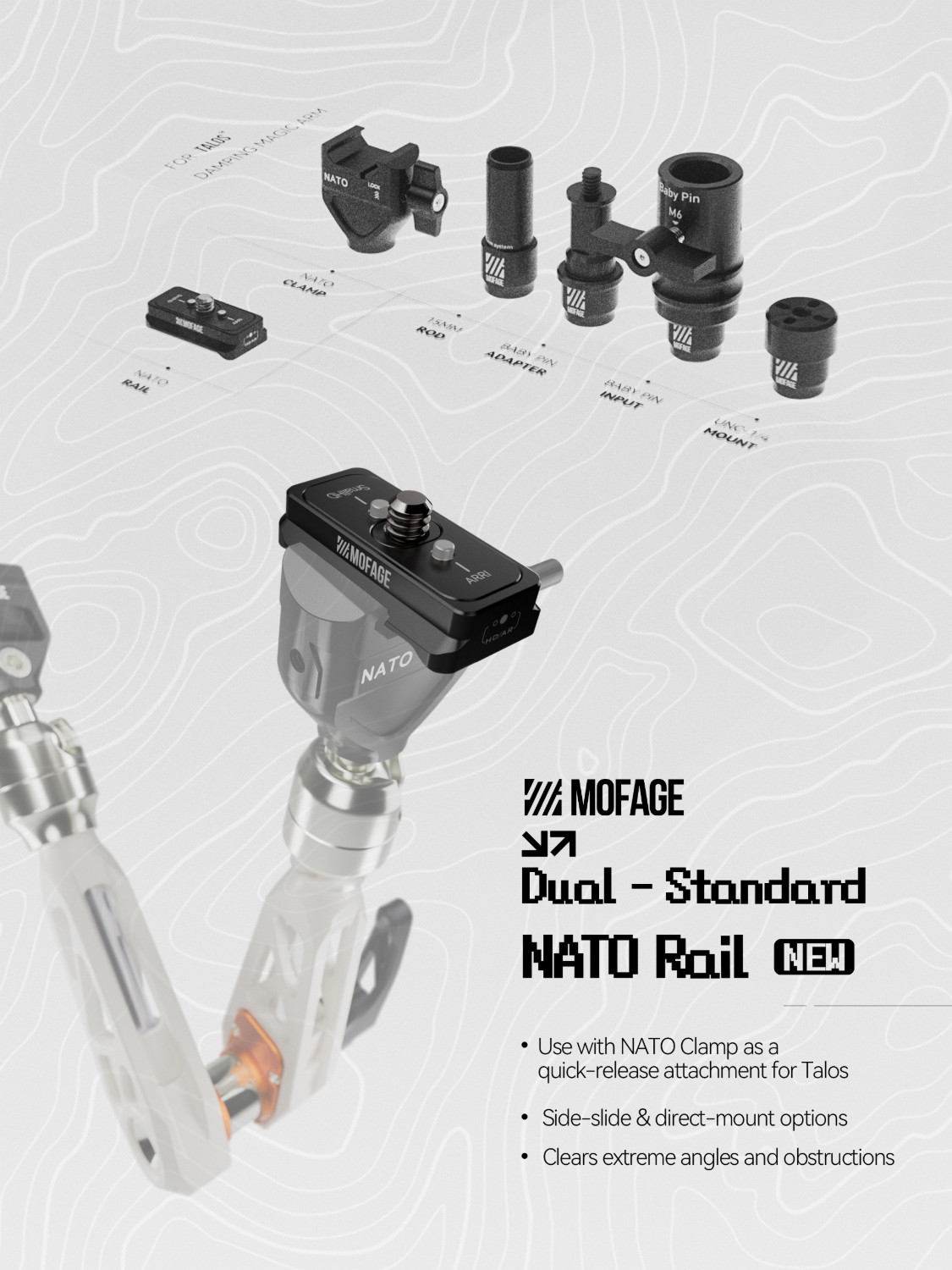 A kettős szabványú (Arri & SmallHD) NATO sín úgy lett kialakítva, hogy a szerelés sokoldalúbb és kényelmesebb legyen. Ezzel bővülnek a teljes összeállítás lehetőségei.