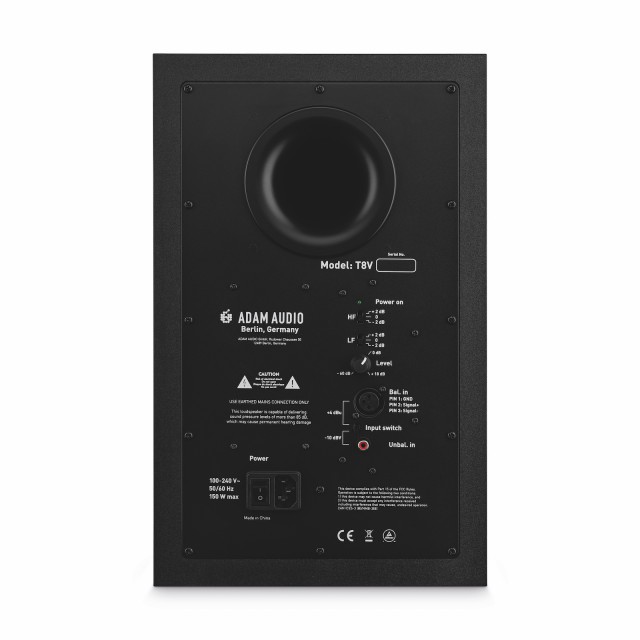 A hátlapon szimmetrikus XLR és szimmetrikus RCA bemenetek, valamint a bemeneti érzékenység, az erősítés, a magas és alacsony pozíció vezérlői találhatók. Az Adam Professional Audio T8V tápkábellel van ellátva.