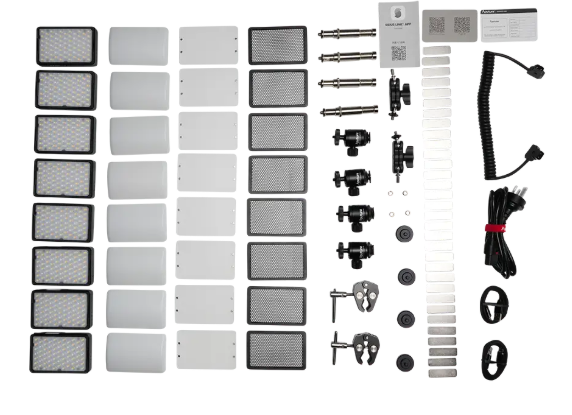 Az Aputure MC Pro 8-Light Kit egy professzionális világítási megoldás, amely nyolc kompakt MC Pro LED panelt tartalmaz, és maximális rugalmasságot és hordozhatóságot biztosít. Minden panel kivételes színpontosságot biztosít CRI 96, TLCI 96, CQS 95 és SSI 86 értékekkel, 2000 K–10 000 K széles, állítható színhőmérséklet-tartománnyal. A passzív hűtés és a Sidus Link, CRMX vagy 16 bites DMX segítségével megvalósuló fejlett vezérlésnek köszönhetően a felhasználók bármilyen produkcióhoz pontos, sima színátmeneteket érhetnek el.