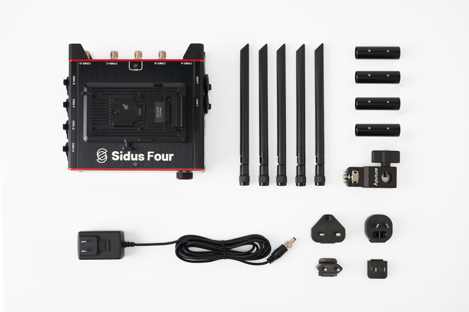 Az Aputure Sidus Four egy négy univerzumos CRMX/DMX adó beépített vezeték nélküli routerrel és Ethernet csomóponttal, amely további négy vezetékes DMX univerzumot támogat. A Sidus Four egyszerre akár 8 DMX univerzumot is képes továbbítani.