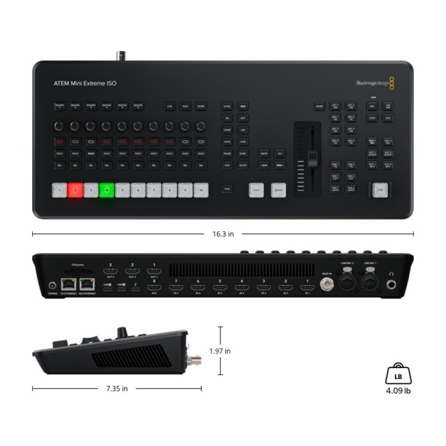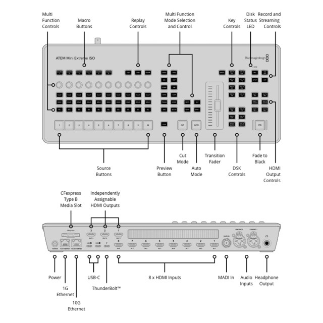 Az ATEM Mini Extreme ISO G2 egy kombinált kapcsoló és vezérlőpanel. Az előlapon gombok találhatók a források kiválasztásához, az átmenetek kiváltásához és a videoeffektusok beállításához. Van egy kézi kar is a (fader) átmenetekhez. Az előlapon található egy vezérlőfelület az audio keveréséhez élő méréssel. Vannak továbbá gombok a felvételhez, a streaminghez és külön kimeneti gombok, amelyek lehetővé teszik a 8 kamera, a program, az előnézet, a több nézet vagy a Fairlight állapot közötti váltást.