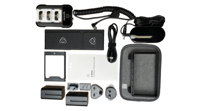 Az Atomos 5" kiegészítő készlet a Ninja és a SHINOBI készülékhez a következőket tartalmazza: napellenző, képernyővédő, DC kábel, gyorstöltő, két NP-F750 5200 mAh és egy EVA tok