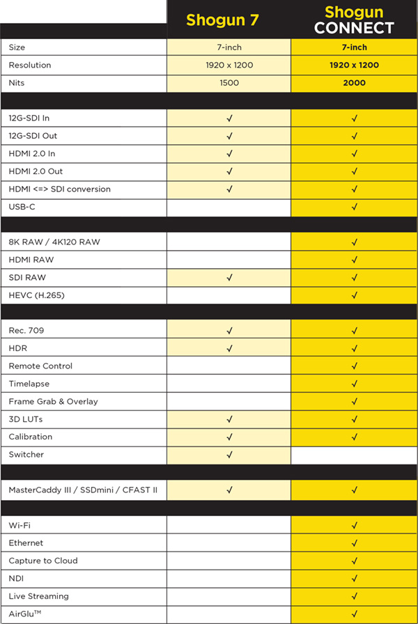 A szuperfényes 7 hüvelykes 2000nit képernyővel és többféle rögzítési lehetőséggel rendelkező Shogun CONNECT prémium élményt nyújt a HDR monitorozáshoz és a RAW rögzítéshez. Ezen kívül 12G SDI-IN és OUT interfészén keresztül átvezető és keresztkonverziós funkciókat is tartalmaz. A Shogun CONNECT támogatja az SDI RAW bemeneteket akár 6K-ig 30fps sebességgel. Egyidejűleg képes SDI-n és HDMI-n keresztül szabványos YCC-videót kihurkoltatni több nem RAW-kompatibilis eszközre.