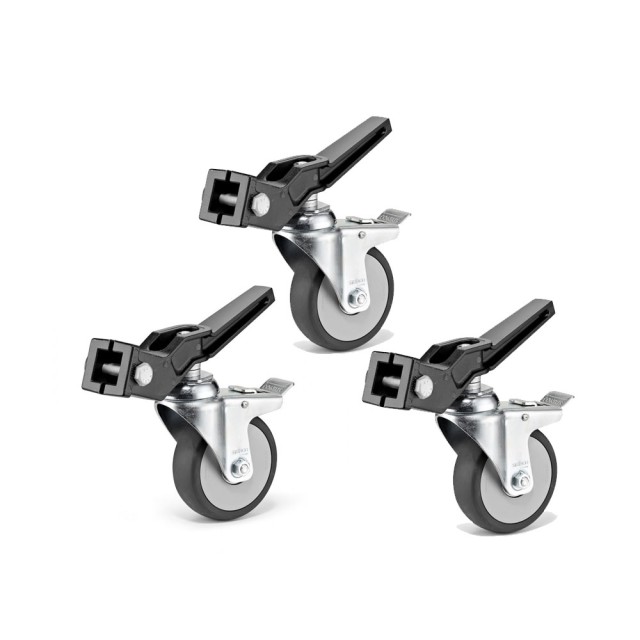 Ez a 3 fékes kerekekből álló készlet 100 mm-es átmérőjű, és ideális 20 x 20 és 25 x 25 mm-es négyzet alakú lábakhoz az állványok kiegészítésére.