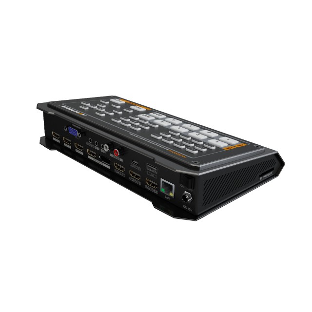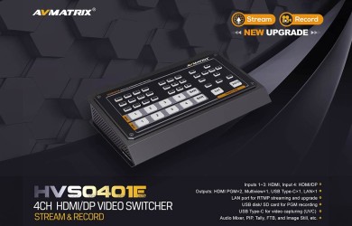 Kapcsoljon át akár egy DisplayPort és négy HDMI videobemenetet, miközben figyelemmel kíséri a programadatokat az AVMATRIX Micro 4 csatornás HDMI és DP videováltójával. Ez a kompakt kapcsoló RTMP streaminget kínál a LAN porton keresztül, támogatja az akár 1080p60 videobemenetet és -kimenetet beágyazott hanggal, és hangkeverést kínál a két analóg sztereó 3,5 mm-es mikrofon/vonal bemenet és kimenet segítségével a beágyazott hanggal együtt. A kapcsoló vezérlési lehetőségei közé tartoznak a nyomógombok, a T-bar és a LAN-porton keresztül történő IP-vezérlés.