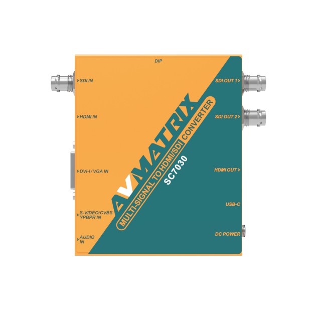 Az AvMatrix SC7030 egy nagy teljesítményű videó skálázó és átalakító, amelyet professzionális videoprodukcióhoz és műsorszóráshoz terveztek. A bemeneti formátumok széles skáláját támogatja, beleértve az SDI, HDMI, DVI-I, VGA, CVBS, S-Video és YPbPr formátumokat, így biztosítva a széles körű kompatibilitást. A kettős SDI és HDMI kimenetekkel rugalmas videóelosztást biztosít. Az SC7030 fel/le skálázást, képkockasebesség-konvertálást és képarány-beállításokat (4:3/16:9) biztosít, így zökkenőmentesen integrálható a különböző munkafolyamatokba. További jellemzői közé tartozik az analóg hang beágyazása, a video- és tápjelek LED-es kijelzői, valamint a DIP-kapcsolókon vagy PC-szoftveren keresztül történő egyszerű vezérlés. A tápellátás menetes záró DC 12V-os vagy USB-C 5V-os csatlakozón keresztül történik, az opcionális levehető tartó pedig rugalmas telepítést tesz lehetővé.