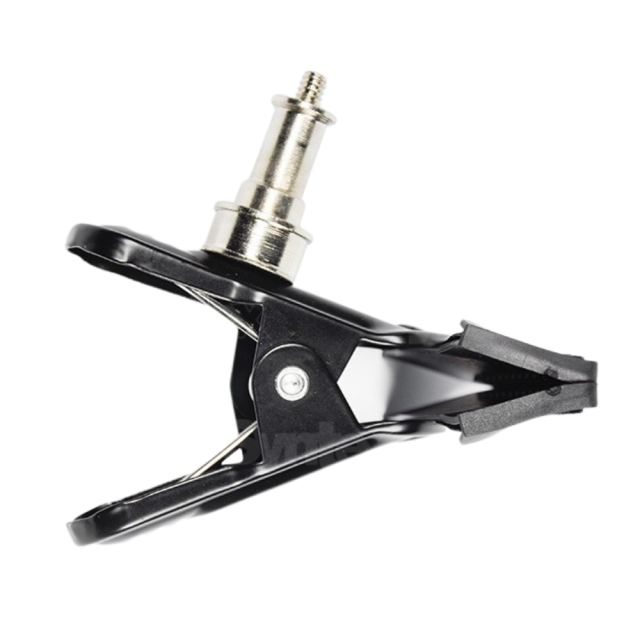 Professzionális fémkapocs klippel és 1/4"-os menettel a háttér rögzítéséhez vagy különböző kiegészítők rögzítéséhez.