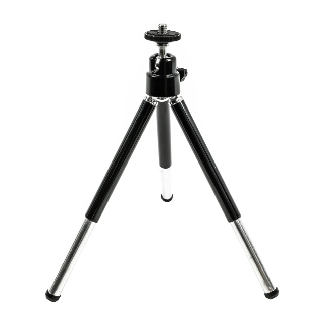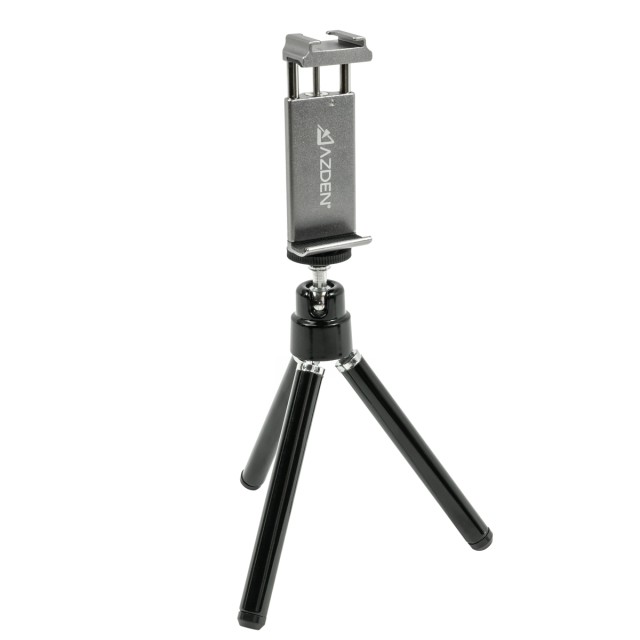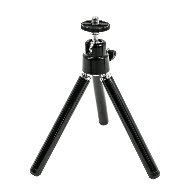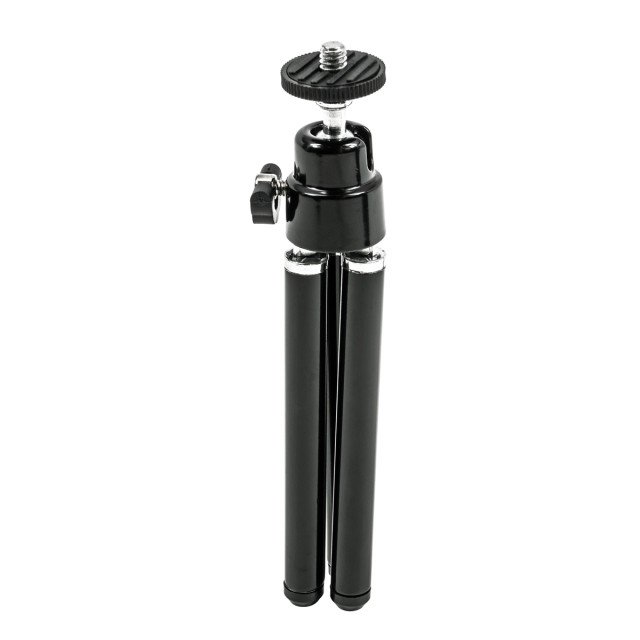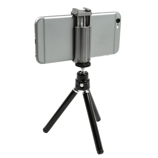 Állvány állványEz a könnyű, miniatűr állvány jól használható asztali állványként okostelefonja számára, vagy a lábak összecsukásával markolattá alakítható az útközbeni videózáshoz. A bővíthető lábak lehetővé teszik az állvány magasságának beállítását 5,0 - 6,5 hüvelyk között. A csuklós gömbcsuklós fej lehetővé teszi a tökéletes dőlés és szög beállítását. A 90º-os dőlés a portré tájoláshoz a rovátkolt oldallal lehetséges, míg a fej egy szárnyas csavarral a helyén rögzíthető. Az állvány univerzális ¼"-20-as rögzítőmenete más kisméretű fényképezőgépekkel is használhatóvá teszi.