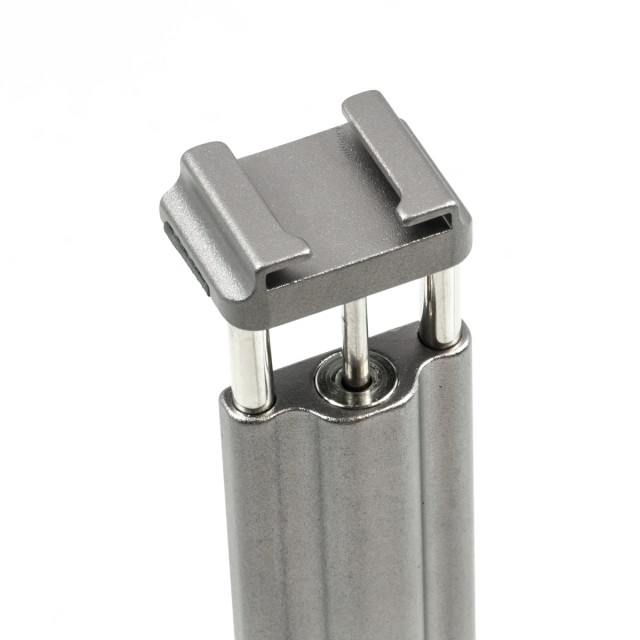 Smartphone rögzítésA mellékelt tartó egy rugós rögzítő segítségével szorosan lefelé tapad szinte bármilyen okostelefonra. A 2,4 hüvelyk - 3,3 hüvelyk közötti telefonszélességű telefonokat képes befogadni, így még a ma kapható legnagyobb okostelefonokkal (phabletekkel) is kompatibilis. Sok más telefontartóval ellentétben a miénk hidegcipő-nyílással van ellátva, amely lehetővé teszi mikrofon, vezeték nélküli vevőegység vagy egyéb tartozékok felszerelését. Maga a tartó a mellékelt állványra vagy bármilyen más kameraállványra vagy rúdra rögzíthető egy ¼"-20-as menetes furaton keresztül. A tartó tartósnak készült, teljesen fémszerkezetű, és minőségét úgy tesztelték, hogy több mint 6000 húzást bírjon ki.