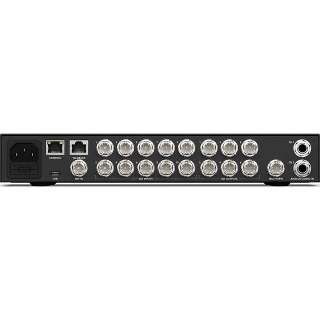 Az ügyfelek HD vagy Ultra HD televíziós szabványú berendezéseket csatlakoztathatnak, beleértve a 720p, 1080i, 1080p és 2160p formátumokat. Az SDI bemenetek a beágyazott hangot is kezelik, és az összes videobemenetből keverik a hangot. A programkimenetek közé tartozik a talkback, a tally és a kameravezérlő információk. Így az ügyfelek a switcher bármelyik SDI kimenetét visszacsatlakoztathatják a kamerához a programvisszajelzéshez, a kameravezérléshez és a talkbackhez.