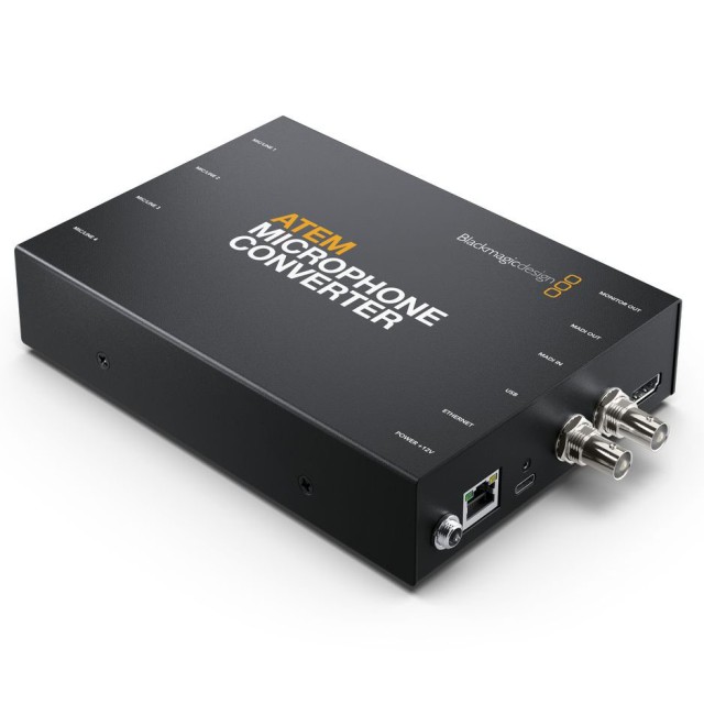 A Blackmagic Design ATEM Microphone Converter egy analóg-digitális audió átalakító, amely lehetővé teszi, hogy az ügyfelek további mikrofonokat adjanak hozzá az ATEM switcher modellekhez, például az ATEM Television Studio HD8-hoz. MADI-kapcsolattal rendelkezik, így az ügyfeleknek nem kell bonyolult beállításokat konfigurálniuk, mivel a csatlakozás egy egyszerű BNC-kábel. A kialakítás elképesztő minőséggel rendelkezik, rendkívül alacsony, -129 dBV-os zajszint, 131 dB(A) dinamikatartomány, alacsony, 0,002%-os torzítás és egységes tűréshatárok minden csatornán. A kialakítás HDMI monitorozó kimenettel is rendelkezik, görgethető hullámforma-kijelzéssel.