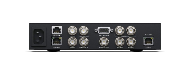 Az opcionális Blackmagic Studio Camera 4K 10G Ethernet interfész átalakító lehetővé teszi a videó, a jelzőparancsok, a kommunikációs csatorna és a kamera tápellátásának átvitelét egyetlen kábelen keresztül, hasonlóan a hibrid SMPTE Fiber interfészhez, de a Cat 6A Ethernet kábel lényegesen alacsonyabb költsége mellett. A Blackmagic Studio Converter kezeli az összes konverziót a felületen, és kiegészíti az Ethernet interfészt a kamera PoE tápellátásával. 2x 12G-SDI I/O, 3G-SDI monitorozó kimenet, 1x RJ-45 10G Ethernet PoE támogatással, I/O időkód és referenciajel (Tri-Sync vagy Black Burst), talkback (SDI 13-16 csatornák és RJ-45), 2,2"-os LCD kijelző, fejhallgató kimenet és beépített hangszóró stb.