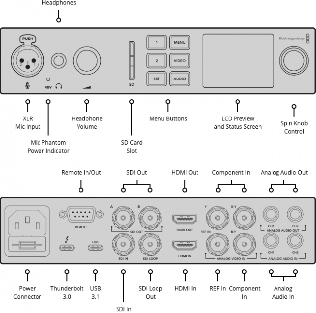 Az UltraStudio 4K Mini egy könnyen hordozható videofelvételi és lejátszási megoldás Thunderbolt 3, 12G-SDI és HDMI 2.0 interfészekkel... Támogatja az összes szabványos 8 és 10 bites videóformátumot DCI 4Kp60-ig, illetve 12 bites DCI 4Kp30-ig. A kompakt váz könnyen beépíthető egy rackbe (és önállóan is működtethető), a használatot pedig nagyban megkönnyíti a vezérlőgombokkal, LCD előnézeti kijelzővel, mikrofonbemenettel (XLR), 1/4"-os fejhallgató kimenettel és SD-kártya foglalattal ellátott előlap, amely lehetővé teszi a rögzített felvételek egyszerű kezelését. A hátlapon található egy USB-C interfész, amellyel például billentyűzetet és egeret csatlakoztathatsz a gazdaszámítógéphez, valamint SDI, HDMI és analóg A/V interfészek; a Thunderbolt 3 interfész támogatja a csatlakoztatott laptop töltését is (akár 45 W)