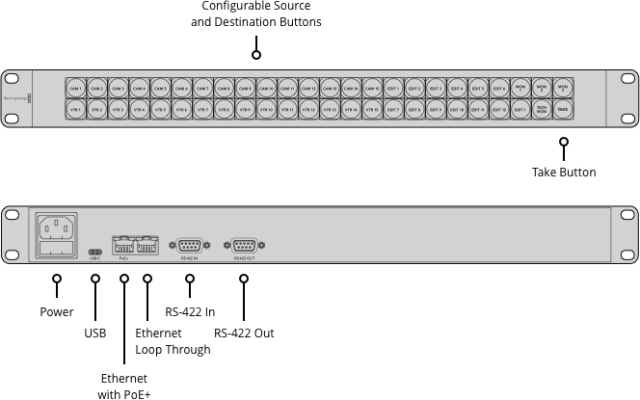 A Videohub Smart Control Pro egy kompakt (1U magasságú) Videohub router vezérlőpanel, amely Ethernet-en keresztül csatlakozik. 48 teljesen konfigurálható gombot kínál, amelyekkel gyorsan válthat a videóforrások között. Egy vagy több célállomáshoz konfigurálható, hogy több monitor, videomagnó stb. videó csatlakozását vezérelje.