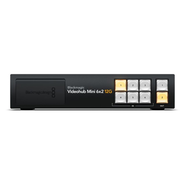 6 12G-SDI bemenetet és 2 12G-SDI kimenetet kínál egy rendkívül kis, 1/2 rack szélességű kialakításban. Minden bemenethez rendelkezésre áll egy hurokkimenet. A Blackmagic Videohub Mini 6x2 12G alkalmas olyan ügyfelek számára, akik szűk helyen dolgoznak, és SDI-berendezéseik bemeneteinek számát szeretnék bővíteni. A Blackmagic Videohub Mini 6x2 12G az SDI műsorszóró berendezések további bemeneteinek hozzáadásán túlmenően 12G-SDI csatlakozókat is tartalmaz, amelyek minden SD, HD és Ultra HD videostandardban működnek 2160p60-ig, egy referencia bemenetet és egy tiszta kapcsolót, amely a videokimeneteken választható. Ez lehetővé teszi például, hogy egy adott forrást csak az egyik kimenetre kapcsoljon, miközben ugyanaz a forrás egyidejűleg közvetlen kimenetként más kimenetekre is átirányítható.