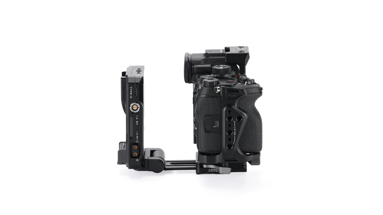 A precízen tervezett konstrukció elegendő helyet biztosít, és megőrzi a fényképezőgép természetes ergonómiáját anélkül, hogy eltakarná a gombokat, az akkumulátor helyét, az eredeti vakukat, a mikrofonfogantyúkat vagy a lencseadaptereket. A csomaghoz tartozik egy kábelkapocs is, amely segít a kábelek rögzítésében és biztosítja a stabil jelátvitelt az HDMI-kábeleken keresztül (kompatibilis a Sony α7V, α7IV és α7R V modellekkel).