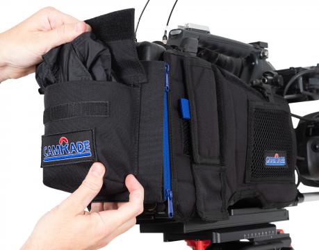 A camCover könnyen rögzíthető a fényképezőgép váza körül a kampós rögzítőkkel, miközben gyors és könnyű hozzáférést biztosít a kezelőszervekhez, a memóriakártya-foglalatokhoz, a csatlakozókhoz, a keresőhöz, az objektívhez és az akkumulátorhoz. A fényképezőgép tetején, a felső fogantyú alatt egy feltekerhető szövetdarab használható a szellőzőegység védelmére.
