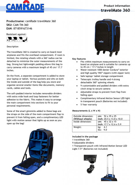 A travelMate 360 a legtöbb repülőgép fedélzetén történő szállítására készült, és elfér a fej feletti rekeszben. Ha a hely korlátozott, a 360°-os sugarú forgó kerekek levehetők, így a táska külső méretei minimálisra csökkenthetők. Az erős, de könnyű párnázottság lehetővé teszi, hogy ez a táska legfeljebb 45 cm/ 17,7 hüvelyk hosszúságú fényképezőgépek szállítására alkalmas legyen. Az elülső oldalon egy külön rekesz található a laptop vagy a táblagép tárolására. A táska belső és külső oldalán található különböző zsebek és rések segítenek számos kisebb tárgy, például dokumentumok, memóriakártyák, kábelek és szerszámok tárolásában és rendszerezésében.