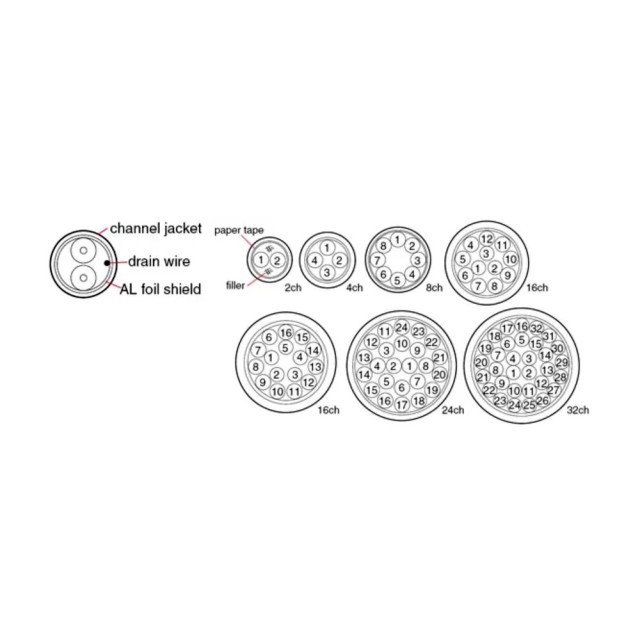Praktikus, 100%-os fóliával árnyékolt többcsatornás audio kígyókábel általános célú stúdióalkalmazásokhoz. Minden egyes, külön-külön szigetelt csatorna 2 sodrott vezetékből áll, amelyek egy fóliás árnyékolásra és lefolyóvezetékre extrudált, könnyen letéphető PVC köpeny alatt helyezkednek el. A színes csíkozású PVC csatornaköpeny megkönnyíti a költséges zsugorcső használatát. Meglepően rugalmas, ez a többcsatornás kábel tökéletes a vezérlőterem elrendezéséhez és a berendezés rackek, audio patchbayek, keverők és szalagdekkek közötti összeköttetéshez.