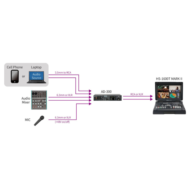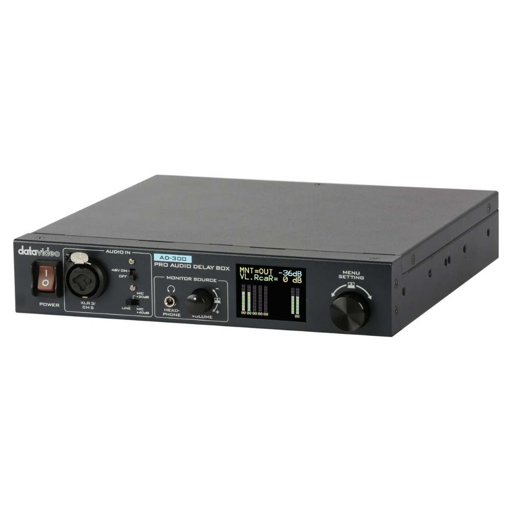 Az AD-300 egy könnyen használható audio delay box, amely lehetővé teszi a videó és a hang szinkronizálását. Az új AD-300 professzionális audio delay box 5 bemeneti és 2 kimeneti csatornával rendelkezik, valamint több audio bemenetet is képes feldolgozni az élő produkcióhoz. Robusztus fémházba épített, terepen vagy stúdiófelszerelésben való használatra.