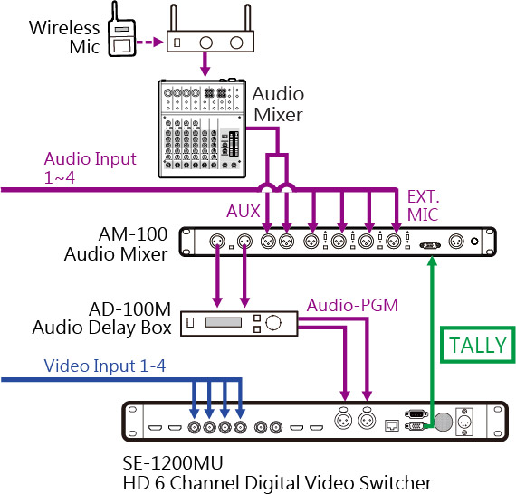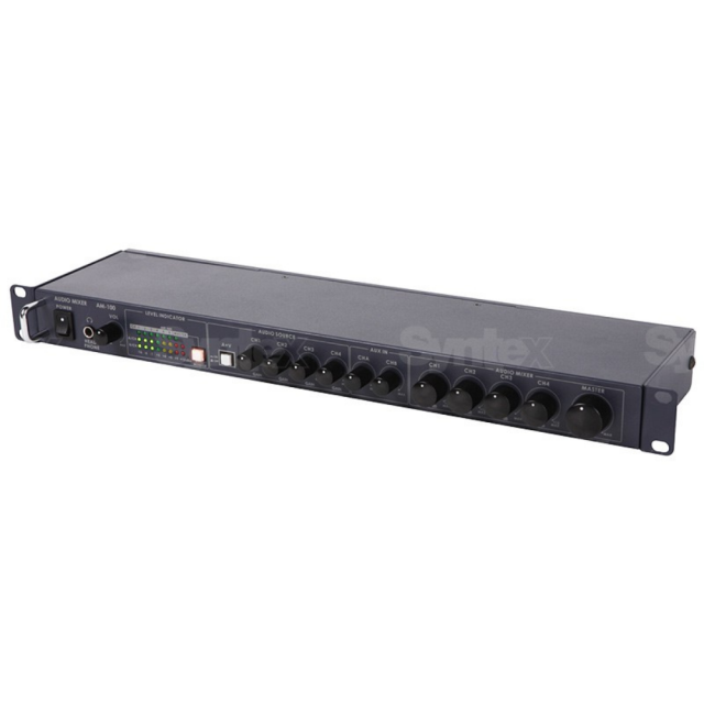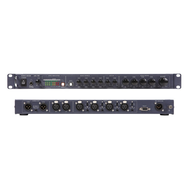 A Datavideo AM-100 egy 6 csatornás (4x mono és 1x sztereó bemenet) 19"-os, 1U magasságú hangkeverő. Támogatja a line vagy mikrofon bemeneteket fantomtáplálással, és az AUX csatorna segítségével több AM-100 keverő is összekapcsolható.