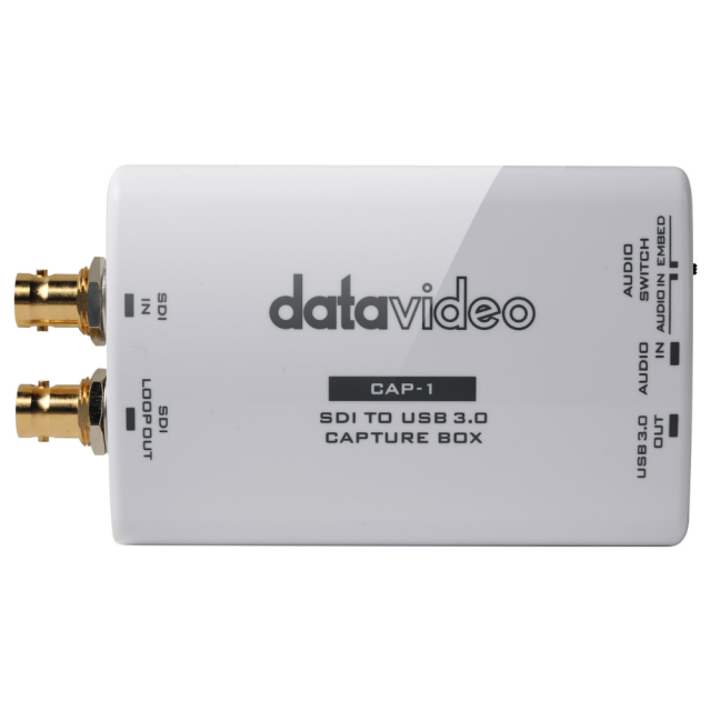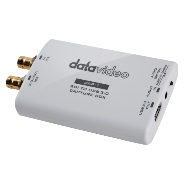 A Datavideo CAP-1 egy SDI > USB 3.0 UVC eszköz HD/3G-SDI eszközökről akár 1080p50/60 videó rögzítésére vagy streamelésére Windows, Linux és macOS számítógépekre a támogatott alkalmazások/szolgáltatások (OBS, VLC, Skype stb.) bármelyikével. Átmenő SDI bemenetet, beágyazott és külső hang támogatását, valamint teljes plug-and-play telepítést kínál.