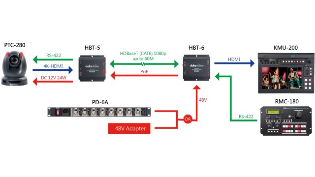 Vevő HDBaseT interfészhez HDMI jelátvitelhez akár 60 m 1080p vagy 35 m 4K@30 felbontásban Cat 6 kábel használatával. Támogatja a HDMI Deep Colour és Full 3D, akár 4K/2K@30 felbontást, HDCP 2.2/1.4, DTS-HD Master Audio és Dolby TrueHD hangot stb. Támogatja a Power-over-Ethernet (PoE) tápellátást és az RS-232/RS-422 parancsokat is. 48V= tápegységgel érkezik.