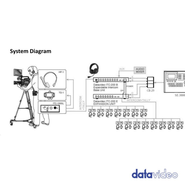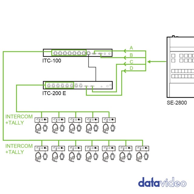 Az ITC-200E további 8 csatornát biztosít a Datavideo ITC-100 tálly/talkback rendszerhez. Az ITC-100/ITC-200E kombinációval gyakorlatilag egy 15 csatornás rendszer áll rendelkezésre. Az ITC-100/ITC-200E kombináció lehetővé teszi a kezelő számára, hogy az 1-7 csatornákat külön-külön, a többi 8 csatornát pedig csoportosan, vagy mind a 15 csatornát egyszerre szólaltassa meg.