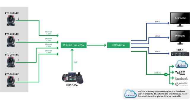 A 255 programozható előre beállított pozícióval a kamerát úgy állíthatja be, hogy gyorsan mozogjon a pozíciók között különböző protokollok használatával, beleértve a DVIP-t LAN-on keresztül, az RS-422-t az opcionális soros vezérlővel, vagy az IR-vezérlést a mellékelt IR-távirányítóval. A kamera a LAN-on keresztüli streaminghez a szokásos, kiváló minőségű H.264 és H.265 protokollok segítségével tömörít, és egyszerre két élő videostreamet kódolhat a szabványos RTSP vagy RTMP protokollok segítségével, amelyek számos internetes streamingoldallal kompatibilisek. A kamera támogatja a külső hangbemenetet is egy 3,5 mm-es sztereó vonalszintű bemeneten keresztül, és a kamerát egy 1/4"-20-as rögzítőmeneten keresztül rögzítheti. A kamerán piros/zöld jelzőfény van, így a szoba tudni fogja, hogy a kamera be van-e kapcsolva vagy sem.