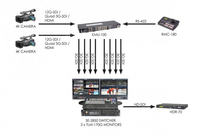 Az új KMU-100 a 4K/UHD kamerakimenetet négy különálló 16x9 HD streamre alakítja át egy HD-SDI interfészen, amelyet az eredeti 4K adatok felhasználó által beállítható vágással hoznak létre! A KMU-100 és egyetlen (vagy két) 4K/UHD kamera segítségével könnyen és olcsón létrehozható egy többkamerás produkció benyomása.