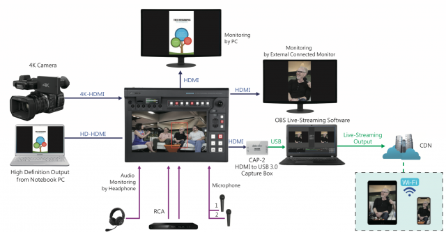 A KMU-200 beépített kódolóval rendelkezik, amely lehetővé teszi, hogy bármely kompatibilis CDN-re hagyományos 16x9 formátumban vagy 9x16-os portré módban streameljen.