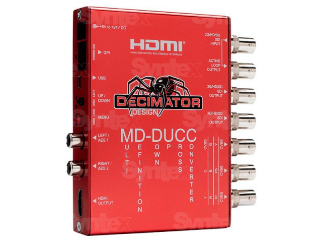 Decimator Design MD-DUCC je multi-Definition Up/Down/Cross konverter. Audio zdroj pre všetky štyri stereo páry v HDMI výstupe môže byť zvolený z ôsmich stereo párov dostupných v SDI vstupe. Keď je aktívny scaler, audio zdroj pre všetkých osem stereo párov v SDI výstupe môže byť zvolený z ôsmich stereo párov dostupných na SDI vstupe.