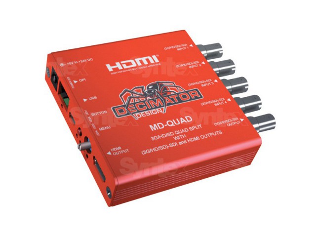 A Decimator Design MD-QUAD v3 egy alacsony költségű, miniatűr 3G/HD/SD-SDI 4-1 Quad Splitter vagy 4-1 bemeneti multiplexer, amely összekapcsolt (3G/HD/SD)-SDI és HDMI kimenetekkel rendelkezik.