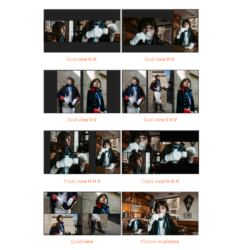 Vízszintes és függőleges monitorozás A vertikális képernyős rendszer iparági úttörőjeként a Desview az OL14/OL16 modelleket nyolc megfigyelési móddal (egyszeres, kettős, hármas és négyszeres osztott képernyő) látta el, amelyek támogatják a szabad vízszintes és függőleges váltást, így egyetlen egység helyettesíti a több hagyományos monitort, ami tökéletes vertikális rövid drámák, rövid videók és élő közvetítések esetén. |