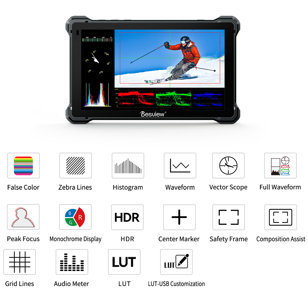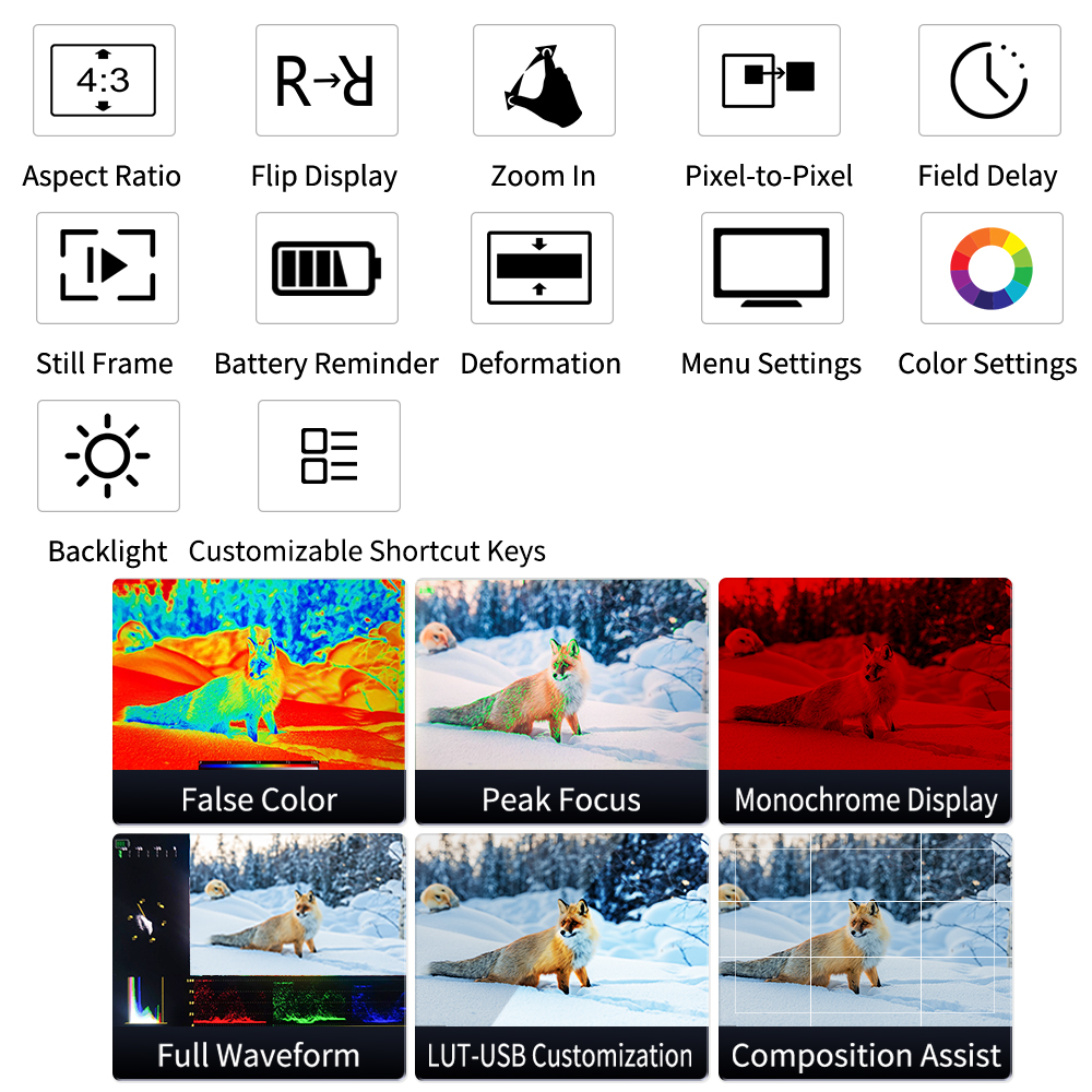 A segédfunkciók teljes skálája Számos kiegészítő felvételi funkcióval rendelkezik, például teljes hullámforma, színhőmérséklet, csúcsfókuszálás, hamis szín, deformációs funkció, zebra vonalak és állókép stb. |