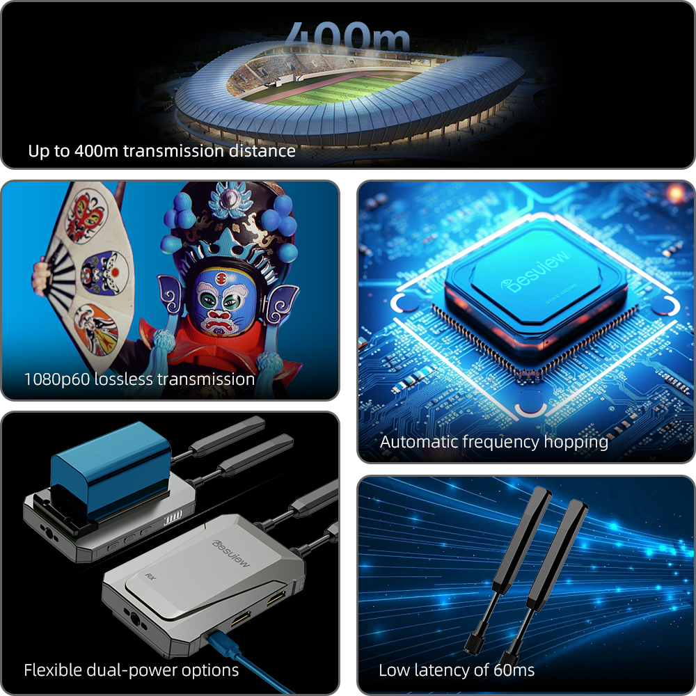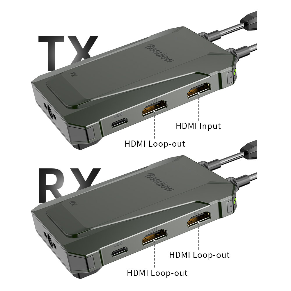 All-in-One portok, gyors beállítás Plug-and-Play jelbemenet:Az adó HDMI bemenettel és HDMI kimenettel rendelkezik, így könnyedén csatlakoztathatja a fényképezőgépet vagy a tükör nélküli fényképezőgépet, és helyi megfigyelést végezhet a könnyű keretezés érdekében.