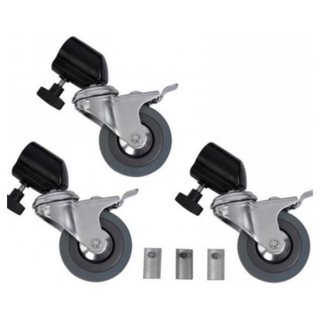 Három kerékből álló készlet 22 mm-es állványláb-adapterrel, fékekkel és M10-es rögzítéssel.