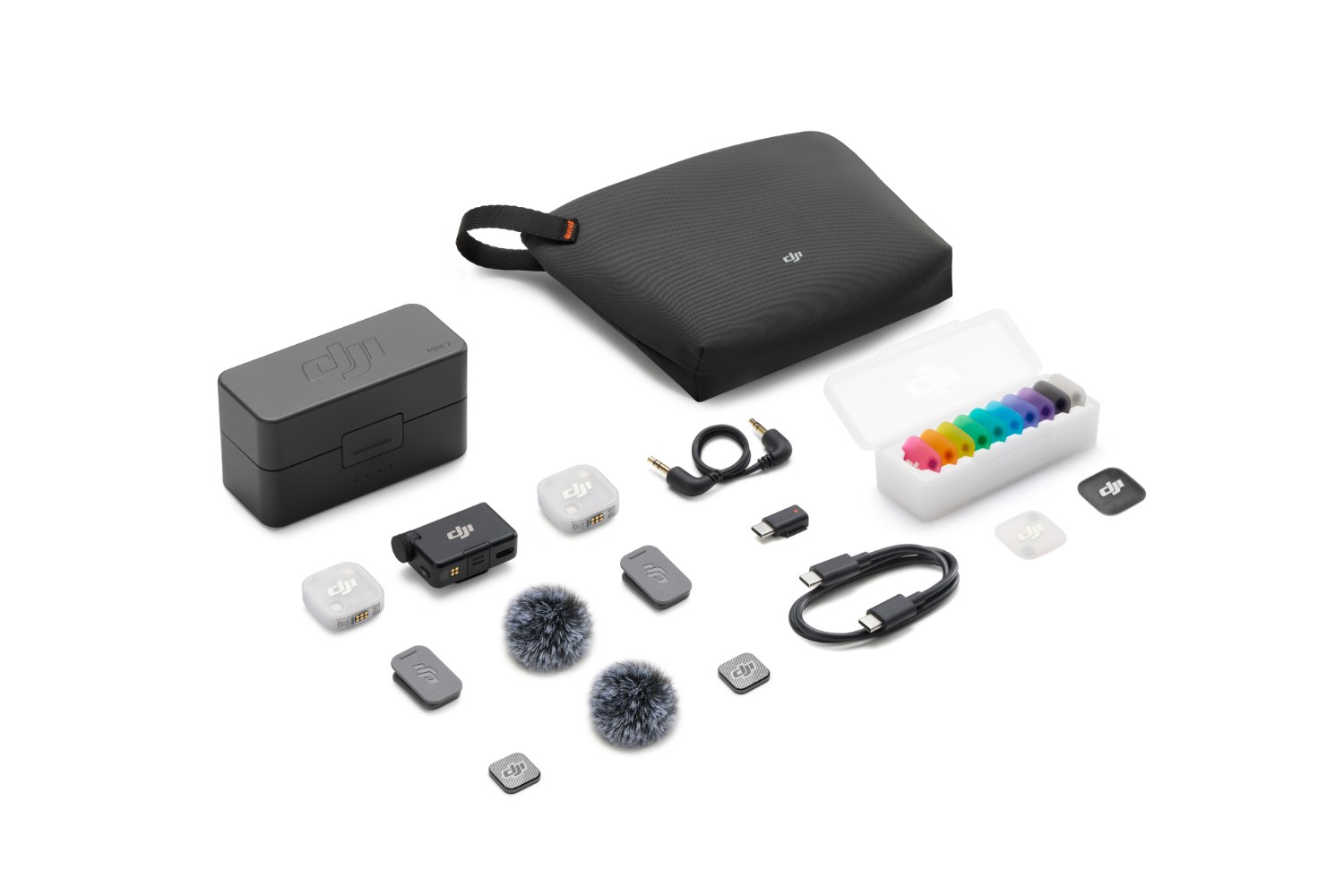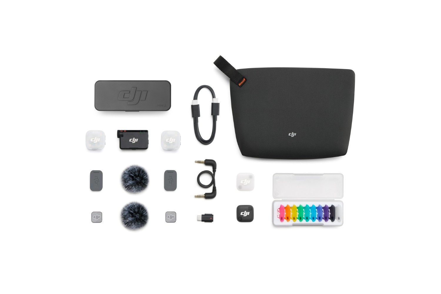 A DJI Mic Mini 2 nyolc színes mágneses elülső burkolattal és öt színes szélvédővel rendelkezik, amelyek bármilyen ruházathoz illeszthetők. A DJI Mic Series Mobile Receiver és a DJI Mic Series Camera Adapter is rendelkezésre áll.