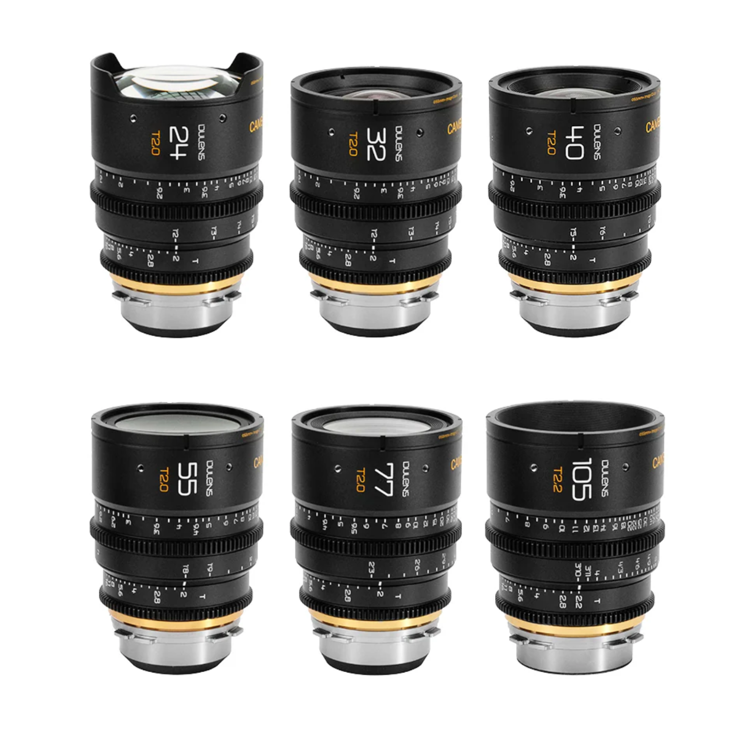 Dulens APO Cambrian Prime 6-lencse készlet (24/32/40/55/77/105 mm T2.0) PL-bajonett, fekete Metrikus: Teljes középformátumú/Vista Vision/nagyformátumú mozi objektívek APO gömb alakú kialakítással, ultra-széles T2.0 rekesszel, krémes vintage stílusú bokeh-hatással, egységes 80 mm-es elülső átmérővel, könnyű alumínium szerkezettel (<850 g/db), V+ bevonattal a nosztalgikus fények és mikrokontraszt érdekében – ideális professzionális narratív, kereskedelmi és nagy szenzoros filmkészítéshez.