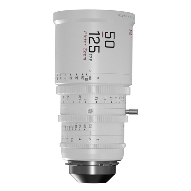 A DZO Pictor 50-125mm T2.8 parfokális filmobjektív Super 35 / APS-C formátumú érzékelőket fed le, T2.8 rekeszértéket kínál a teljes gyújtótávolság-tartományban, és cserélhető PL és EF bajonettel rendelkezik. Az objektív kialakítása gyakorlatilag kiküszöböli a légzést, és a 16-os napellenzőnek köszönhetően végig éles rajzolatot és a jelenet szép megjelenítését biztosítja a mélységélességen túl. Természetesen a fókusz-, rekesz- és zoomgyűrűk fogazottak az egyszerű távvezérléshez az oldalsó fókuszrendszerekkel (M0.8; a fókuszgyűrű mozgása 270°). Az elülső átmérő a hagyományos kompendiumok szabványos 95 mm-es átmérője, a szűrőmenete 86 mm-es. Van egy láb is a lencse alátámasztására a fúrótornyon belül. Fehér változat. Tömeg kb. 1700 g. PL és EF bajonettekhez.