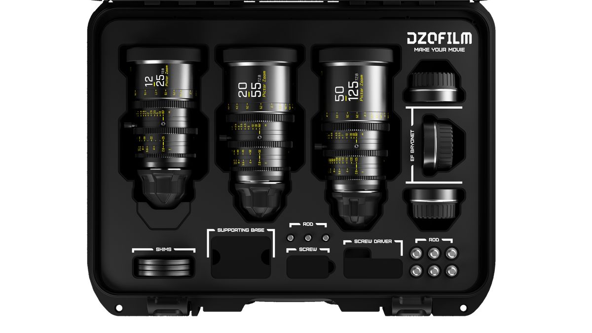 Három DZOFilm Pictor Zoom T2.8 objektívből álló készlet - 12-25mm, 20-55mm és 50-125mm - egy hordtáskában. Mindegyik objektív alapfelszereltségként PL-bajonettel, valamint Canon EF cserélhető bajonettel is rendelkezik a digitális filmes fényképezőgépek széles választékával való kompatibilitás érdekében.