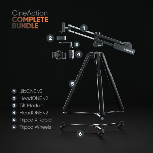 A készlet tartalmazza: JibONE v3, HeadONE v2, Tilt Module, HeadOne v2, Tripod X Rapid, Tripod Wireless