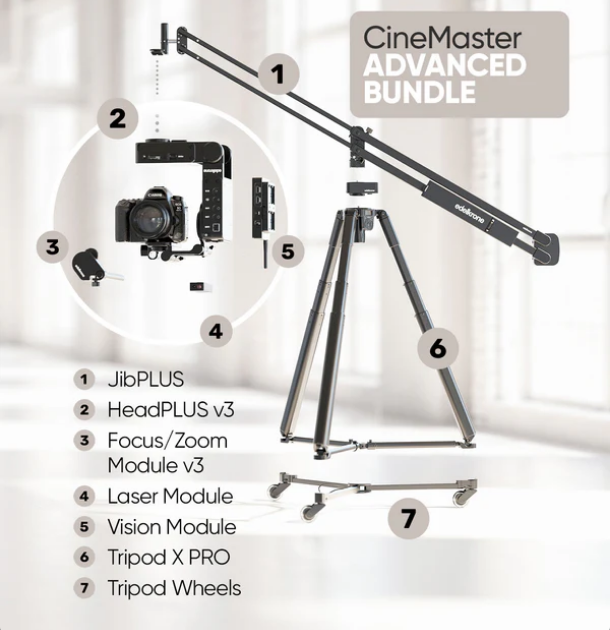 Az Edelkrone CineMaster Bundle - Advanced egy teljes mozgásvezérlő rendszert kínál, beleértve a JibPLUS, HeadPLUS v3, Focus/Zoom modul, Vision modul, Laser modul, Tripod X PRO és Tripod kerekek. Pontos, filmszerű kameramozgásokat biztosít a szakemberek számára, akiknek célja, hogy könnyedén és rugalmasan készítsenek magával ragadó felvételeket.