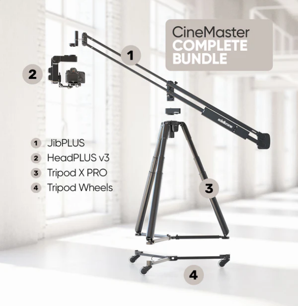 Az Edelkrone CineMaster Bundle - Complete tartalmazza a JibPLUS, HeadPLUS v3, Tripod X PRO és az állványkerekeket, amelyek átfogó mozgásvezérlő rendszert biztosítanak a sima és pontos filmes felvételek készítéséhez.