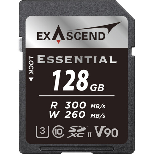 Az Exascend Essential Series SDXC UHS-II memóriakártyákat nagy bitrátájú sorozatfelvételekhez és videofelvételekhez tervezték a képkockák kiesésének kockázata nélkül, valamint gyors olvasási sebességgel a zökkenőmentes adatátvitelhez az utómunka során. A kártyák az UHS-II busz segítségével akár 300 MB/s folyamatos olvasási sebességet és 260 MB/s folyamatos írási sebességet érnek el; a V90 tanúsítvány biztosítja, hogy a minimális írási sebesség nem csökken 90 MB/s alá. A nagyobb megbízhatóság érdekében az Essential sorozat masszív kialakítású, amely ellenáll a víznek, pornak, ütésnek, röntgensugárzásnak, mágneses mezőknek és a -25 és 85°C közötti hőmérsékletnek. A kártyák kapcsolóval is fel vannak szerelve a véletlen írás elleni védelem érdekében.