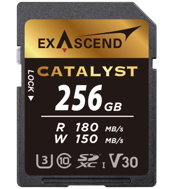 Az Exascend Catalyst sorozatú SDXC UHS-I kártyák a professzionális fotós és filmes szakemberek számára elegendő teljesítményt nyújtanak a nagy felbontású és képkockasebességű felvételek készítéséhez és sorozatfelvételekhez. A 256 GB-os modell 180 MB/s maximális folyamatos olvasási sebességet és 150 MB/s maximális sorozatírási sebességet kínál; a kártya V30 tanúsítvánnyal rendelkezik, amely garantálja a legalább 30 MB/s feletti írási sebességet.