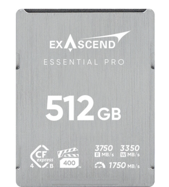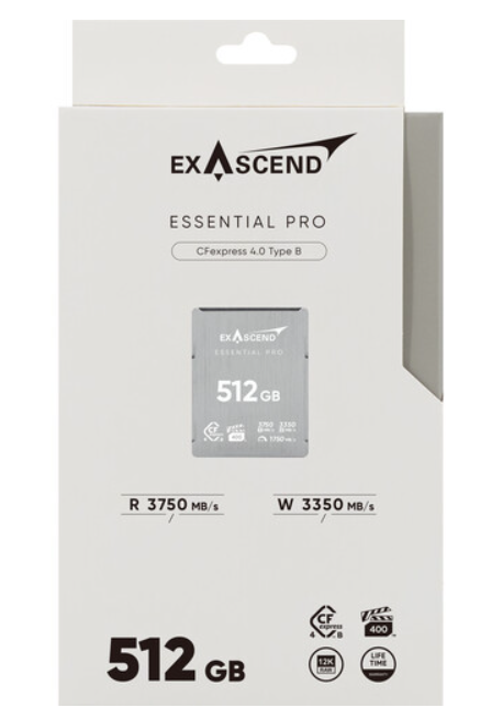 Az Exascend EXPC4EB512GB Essential Pro CFexpress 4.0 Type B 512 GB-os kártya 3750 MB/s olvasási és 3350 MB/s írási sebességet biztosít 8K/12K 120 fps videókhoz. VPG-400 tanúsítvánnyal rendelkezik, adaptív hőszabályozással, 300 TB TBW tartóssággal és életre szóló garanciával, adat-helyreállítással.